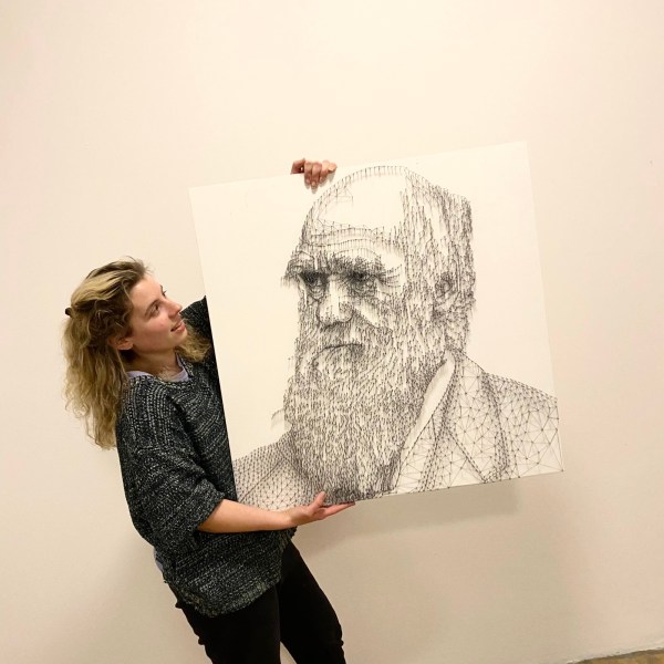 Imogen is a Birmingham based artist who creates portraits using nail and thread. She graduated from Kingston University in Fine Art in 2013, and after taking a few years out to focus on youth work, has recently returned to exploring her art practice. She's influenced by the traditional craft of hand-embroidery but her style of work puts a contemporary spin on threadwork. Her method of making consists of wrapping thread around nails which pinpoint the contours of the face to build up a mesh-like form made up of triangles. Imogen builds up layers and layers of these triangles to detail the subjects' features and create depth to the image.